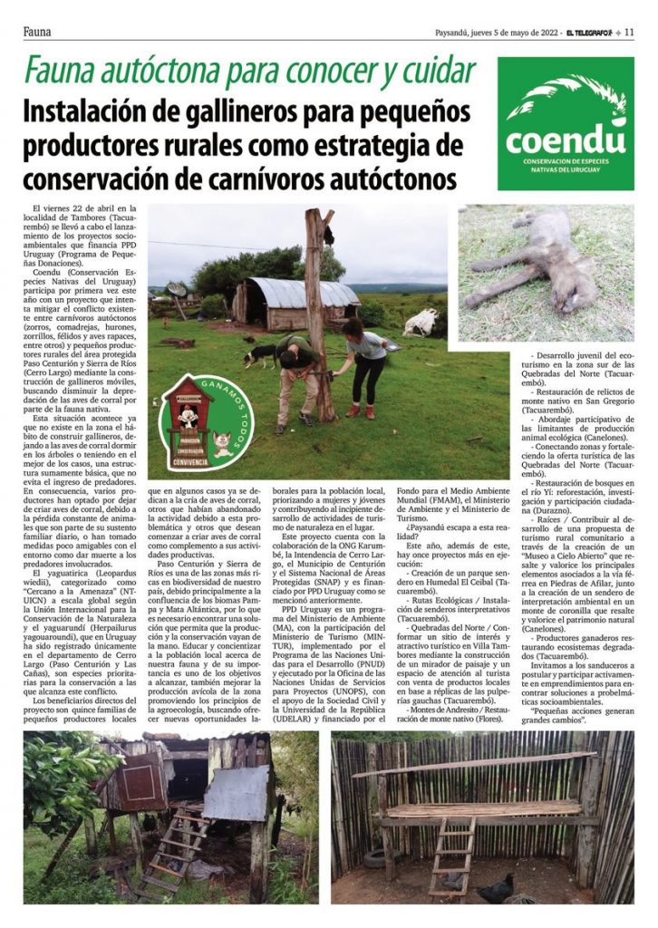 El proyecto encabezado por las organizaciones Conservación Especies Nativas del Uruguay (COENDU) y Karumbé buscó mejorar la producción avícola que se lleva a cabo en el área protegida Paso Centurión y Sierra de Ríos, en el departamento de Cerro Largo, bajo los principios de la agroecología.